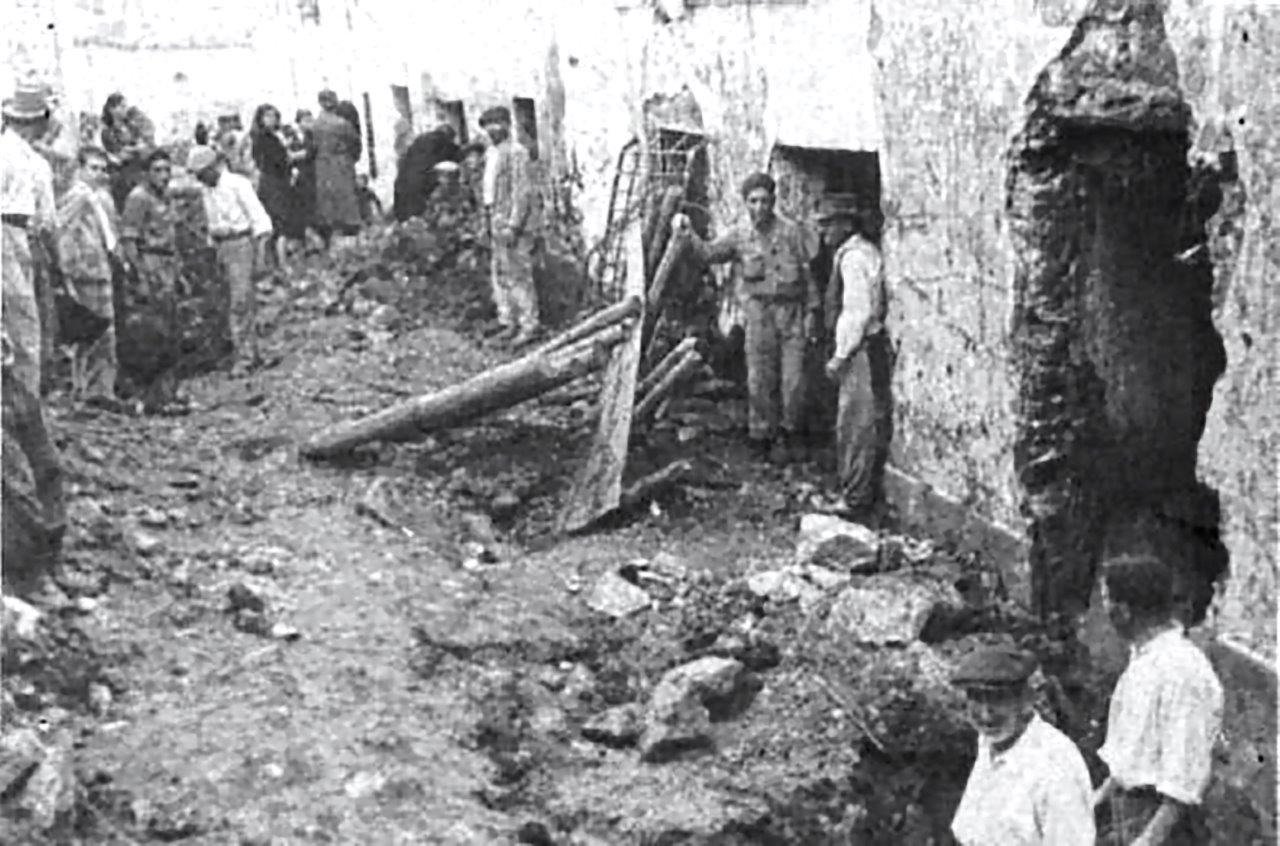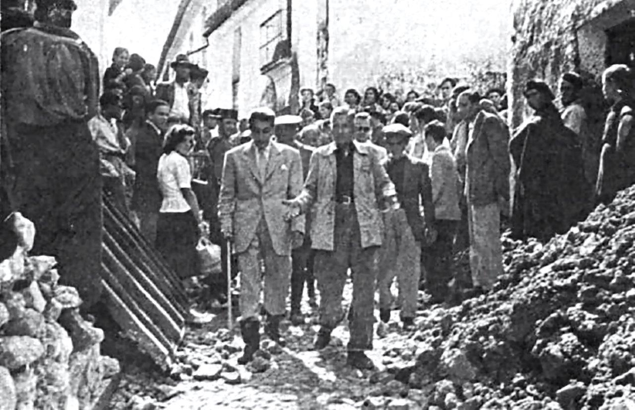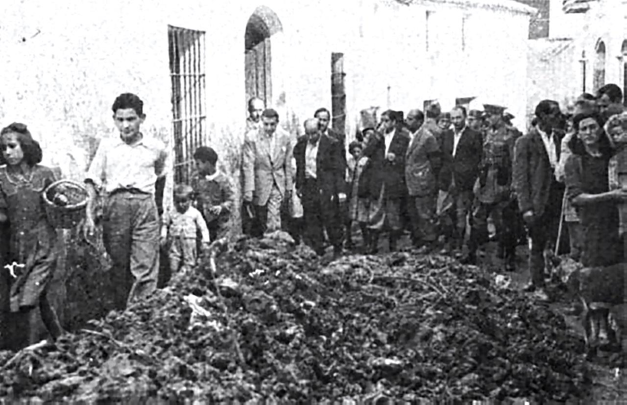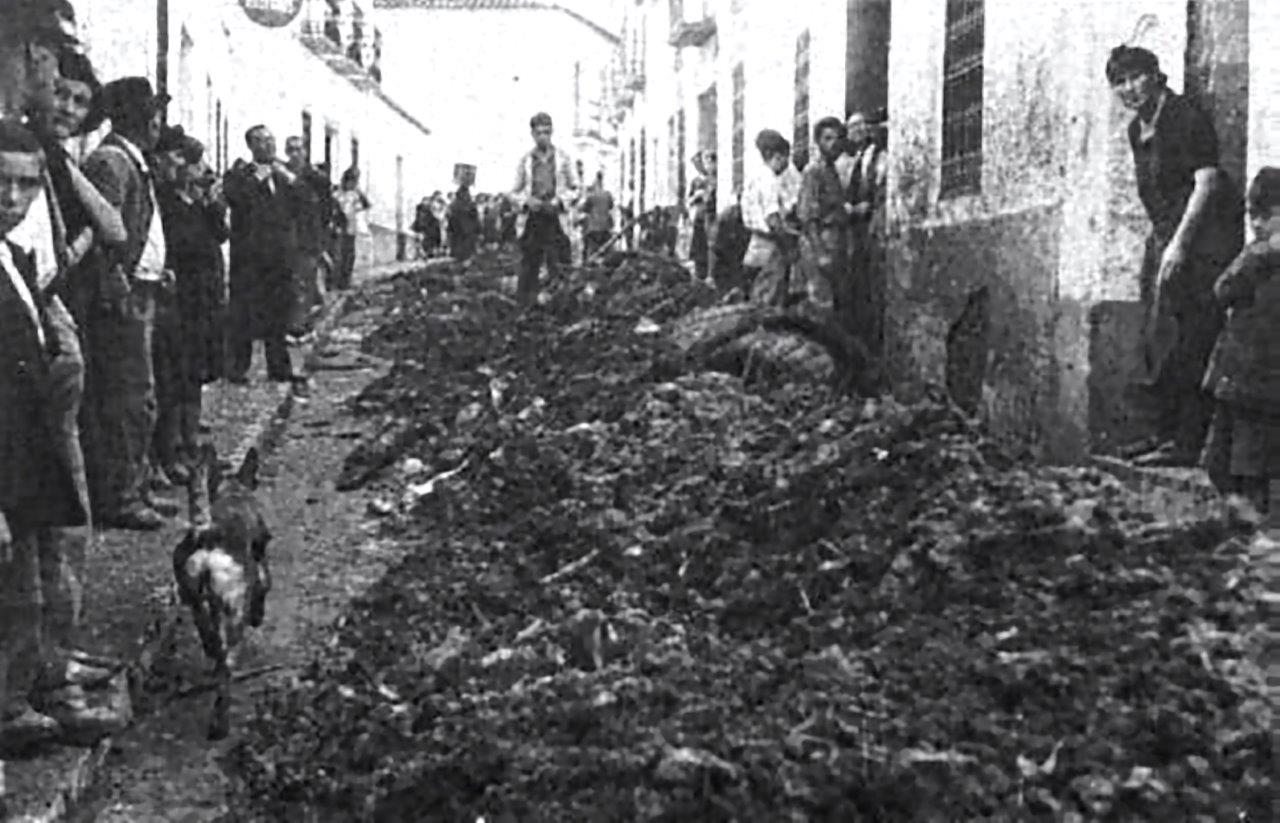 Sobre las dos de la tarde las nubes comenzaron a descargar agua con una intensidad tan sorprendente y aterradora que “a los pocos minutos las calles se convertían en torrenteras. Un ruido sordo de piedras desbocadas y un constante susurro de cauce atropellado se dejaba oír de arriba abajo, rompiendo muros y tabiques, descuajando cimientos, abriendo grandes bocas en las fachadas y en las tapias. En algunas calles. el nivel de arrastre llegaba a la altura de los tejados. En el colmo del desastre la enorme alcantarilla, que cruza casi por la mitad el pueblo se obstruye por la increíble magnitud de los arrastres: y rompe por el interior de las viviendas dejando todo al descubierto.
